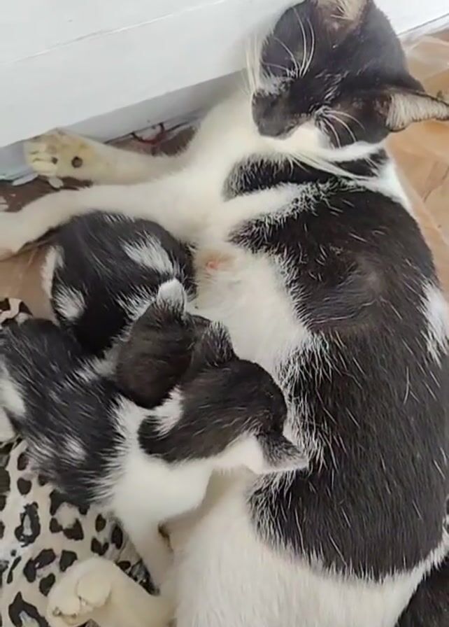 - "A close-up, high-angle shot depicts a black-and-white cat lying on its side on a leopard-print blanket, nursing three similarly colored kittens" by FM-Fz47q1, licensed under CC BY 4.0