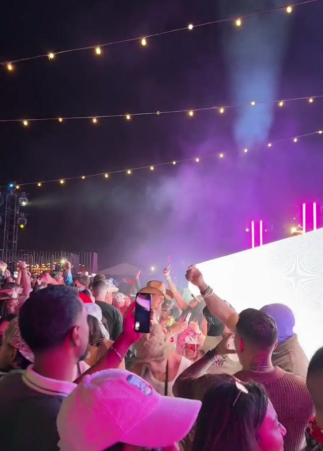 The scene shows a crowd of people at an outdoor event at night. The sky is dark and there are string lights overhead. In the background, there is a stage with a bright white screen and purple lighting. Smoke or fog is being released. Many people are facing the stage, some with their arms raised and holding up phones. The crowd seems to be enjoying a concert or party.