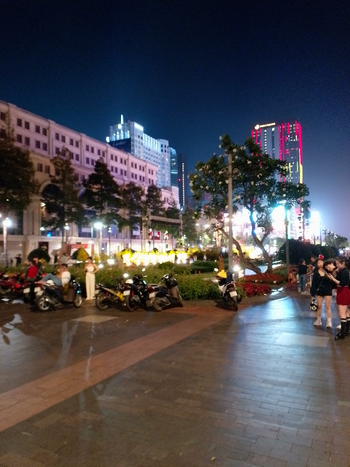 A nighttime scene features a public square with walkways illuminated by streetlights. Buildings are visible in the background, one with bright red and yellow accents. Trees and flowerbeds decorate the scene. Several motorcycles are parked along the edge of a garden. People stroll along the walkway, including a group of young women with shopping bags. The ground is paved with light-colored bricks, reflecting the ambient light.