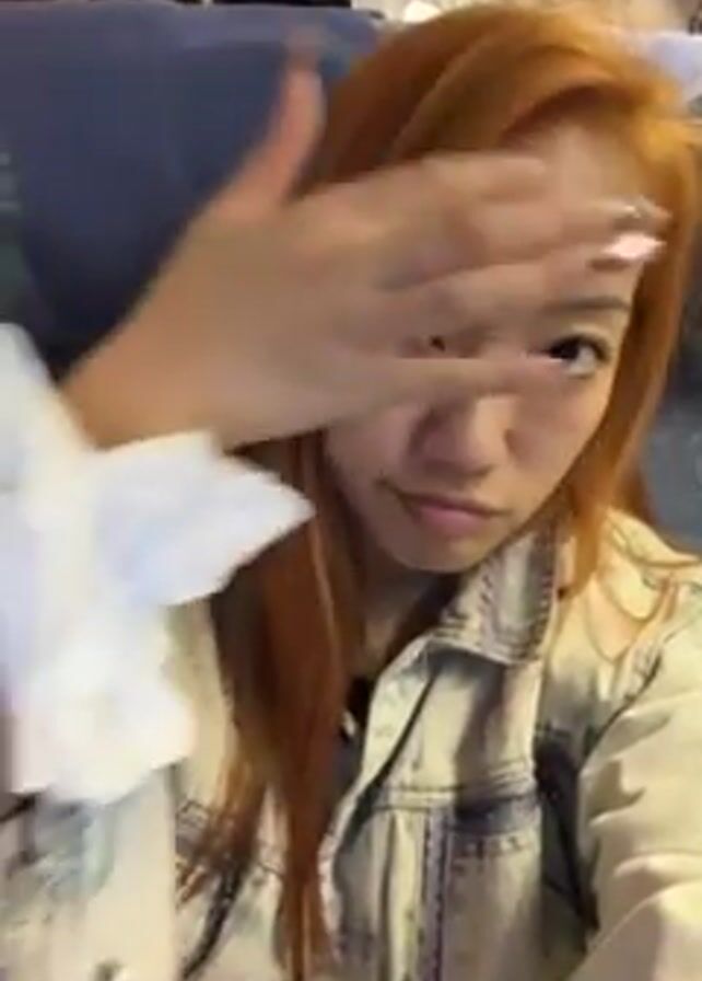 A young woman is sitting on an airplane, filming a selfie video. She has orange hair and is wearing a light-colored denim jacket. She first makes a pouty face and then smiles and waves. The interior of the airplane is visible behind her, with other passengers seated in their seats.