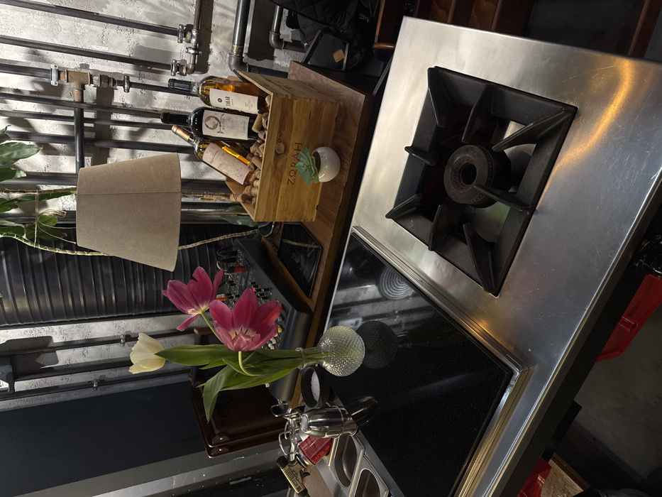 The image depicts an interior scene, likely a bar or open kitchen area, located in the city of Yerevan, Armenia. In the immediate foreground, a stainless steel counter runs horizontally. On its left side are two embedded rectangular metal compartments, followed by a small silver shaker and a black bowl containing white granular material (likely salt). Centrally positioned on the counter is a clear, textured glass vase holding three tulips: one white and two magenta, exhibiting a slightly drooped appearance. Adjacent to the vase, to its right, is a black, reflective flat cooking surface, possibly an induction cooktop. Further right, integrated into the stainless steel counter, is a single gas burner unit with a square black cast-iron grate. Behind the counter, a light-colored wooden surface serves as a shelf. On the left section of this shelf, a black audio mixing console with multiple knobs and sliders is visible. To the right of the console, a wooden crate, engraved with the brand "ZORAH," is filled with numerous wine corks and holds three wine bottles: one light-colored, one dark bottle with a prominent circular label (identified as Zorah Karasi), and one amber-colored bottle labeled "TAKAR." A small white potted succulent plant is placed in front of the "ZORAH" crate. A table lamp with a beige fabric shade stands behind the wine display, providing illumination. The background consists of a light gray, textured wall, likely concrete or stucco, adorned with exposed industrial-style metal pipes, conduits, and valves running vertically and horizontally. Partial views of dark furniture, possibly a chair back, are discernible on the far left. Green foliage, appearing to be from hanging plants, is visible in the upper left and right portions of the frame. The lighting is low, creating reflections on the metallic and dark surfaces. No individuals are present in the scene.
