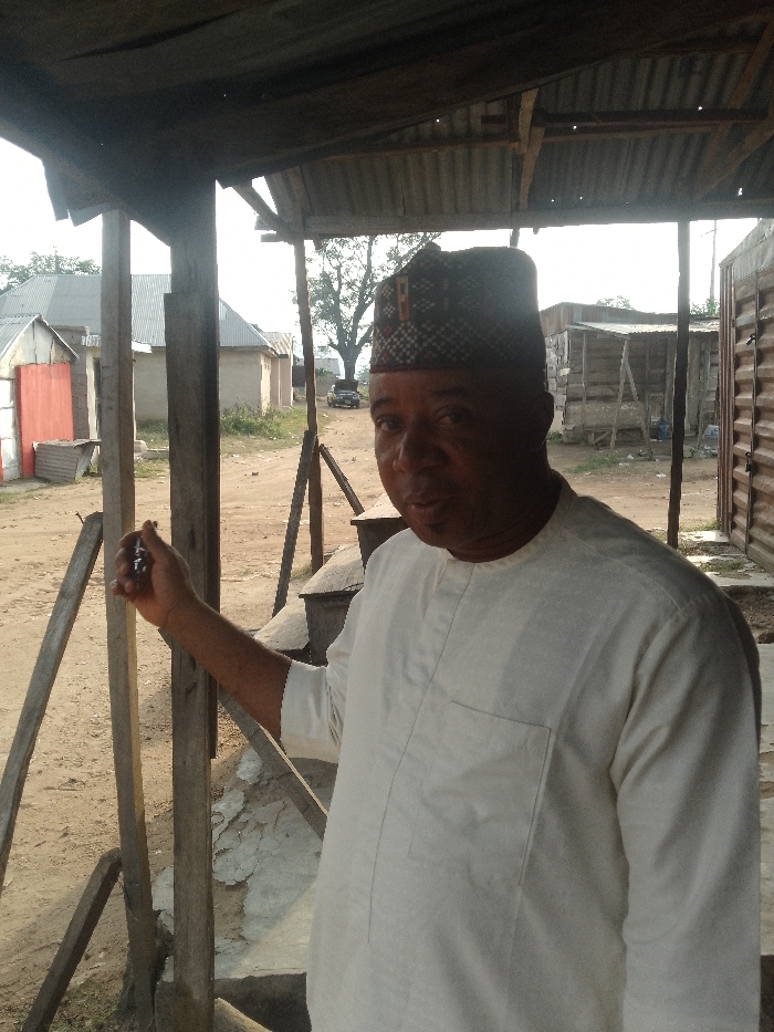 An older man stands under a corrugated metal roof supported by wooden beams. He wears a dark patterned hat and a light colored, long-sleeved shirt. He's holding a small, dark object in his left hand, arm extended. In the background are simple buildings, some with corrugated metal roofs, and a dirt area. The setting appears to be a rural or underdeveloped location.