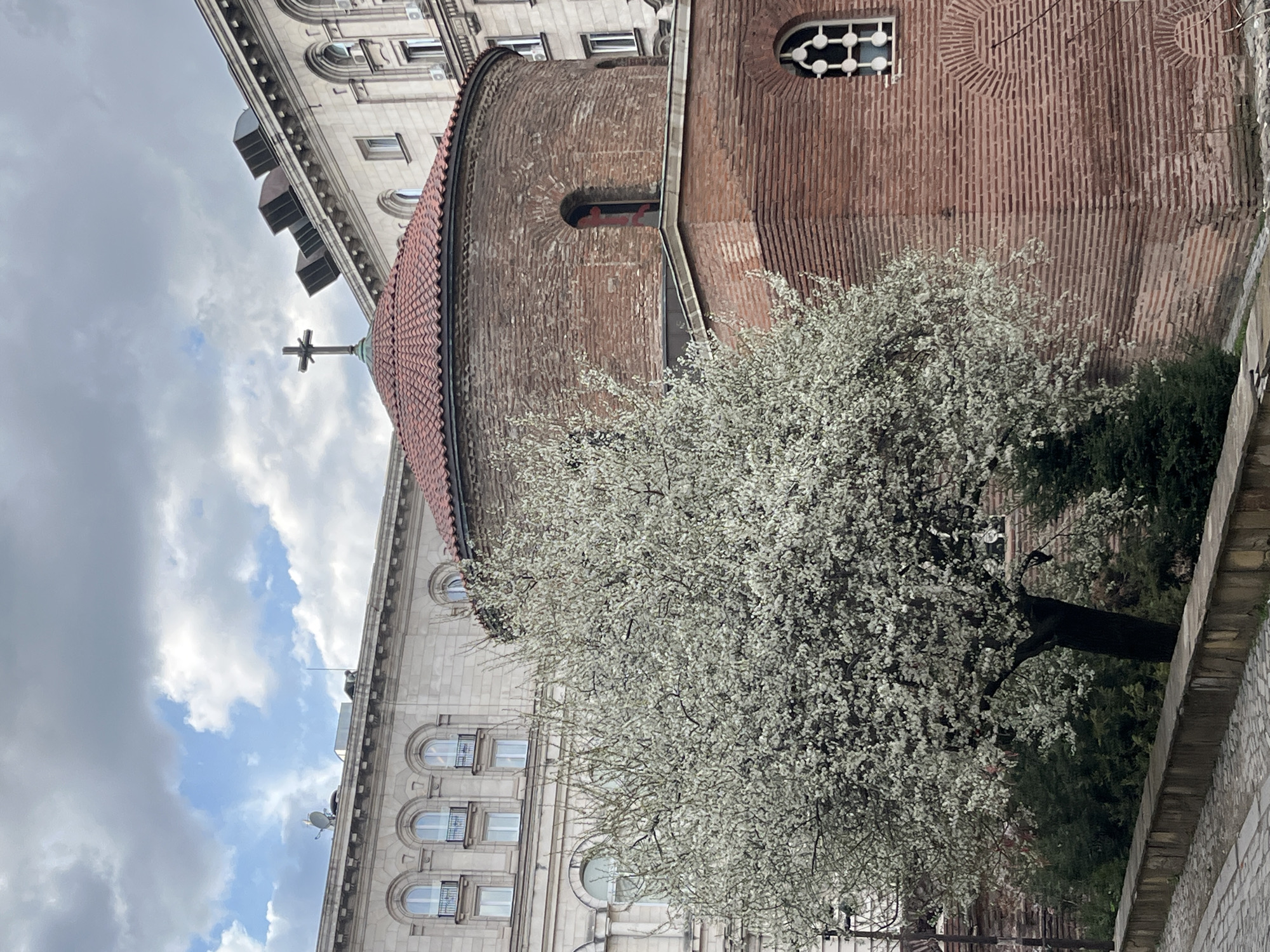 A forensic description of the image reveals the Church of St. George Rotunda, located within the courtyard of the Presidency building in the city of Sofia, Bulgaria. The central subject is a circular brick church with a domed, red-tiled roof surmounted by a dark cross. The church walls are constructed from reddish-brown bricks, laid in alternating wider and narrower courses. A single arched window opening is visible on the upper circular section of the church, revealing a red interior or object. A lower, rectangular section of the church features an ornate, arched white window with a gridded pattern. In the mid-ground, a large deciduous tree is in full bloom, covered entirely in small white blossoms, partially obscuring the church's lower left side. To the immediate left and extending into the foreground, a cobblestone pathway runs diagonally upward from the bottom left corner. A low stone retaining wall, constructed of irregularly shaped light grey stones, separates the path from a planted area containing green shrubbery and the base of the blooming tree. In the background, behind the church and tree, stand two multi-story, light-colored stone buildings exhibiting classical architectural elements. The building to the left features multiple arched windows with small black balcony railings. The building to the right also shows several windows and what appear to be modern rooftop ventilation units. The roofline of the left background building includes a small white satellite dish. The sky overhead is partly cloudy, with areas of light blue sky visible between darker grey clouds. No individuals are present in the scene.