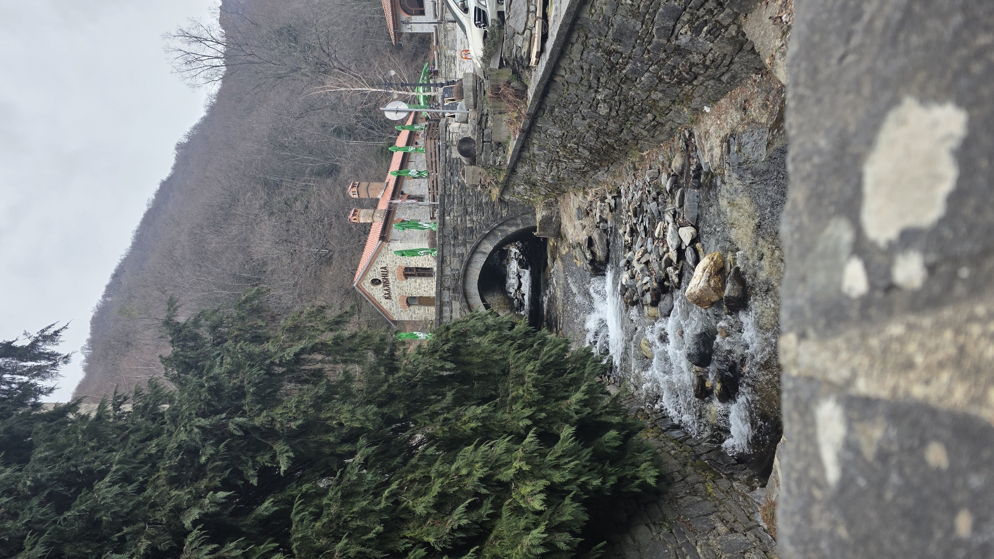 The image depicts a stone arch bridge spanning a rocky river in the city of Rilski manastir, Bulgaria, likely in a rural or mountainous area, given the bare hills in the background. The foreground is blurred, showing a grey stone surface with white markings. The river flows from beneath the bridge towards the viewer, agitated by numerous grey and brown rocks, creating white water rapids. The river banks are lined with dry-stacked stone walls. Above the bridge, on the right bank, stands a two-story building with a stone facade and a red-tiled gabled roof featuring two brick chimneys. The Cyrillic word "КЛАДНИЦА" (Kladnitsa) is prominently displayed on its front wall. In front of this building, an outdoor seating area is visible with multiple green umbrellas and wooden benches/tables. A paved area or road runs adjacent to the building, where a white vehicle (appears to be a Mercedes-Benz van or SUV) is parked. A white circular sign with a red border is mounted on a pole near the parked vehicle. To the left, a large evergreen tree with dense, dark green foliage occupies a significant portion of the frame, obscuring part of the background and riverbank. The background features a steep hillside covered primarily with bare deciduous trees under an overcast sky, suggesting late autumn or early spring. No people are visible in the scene.