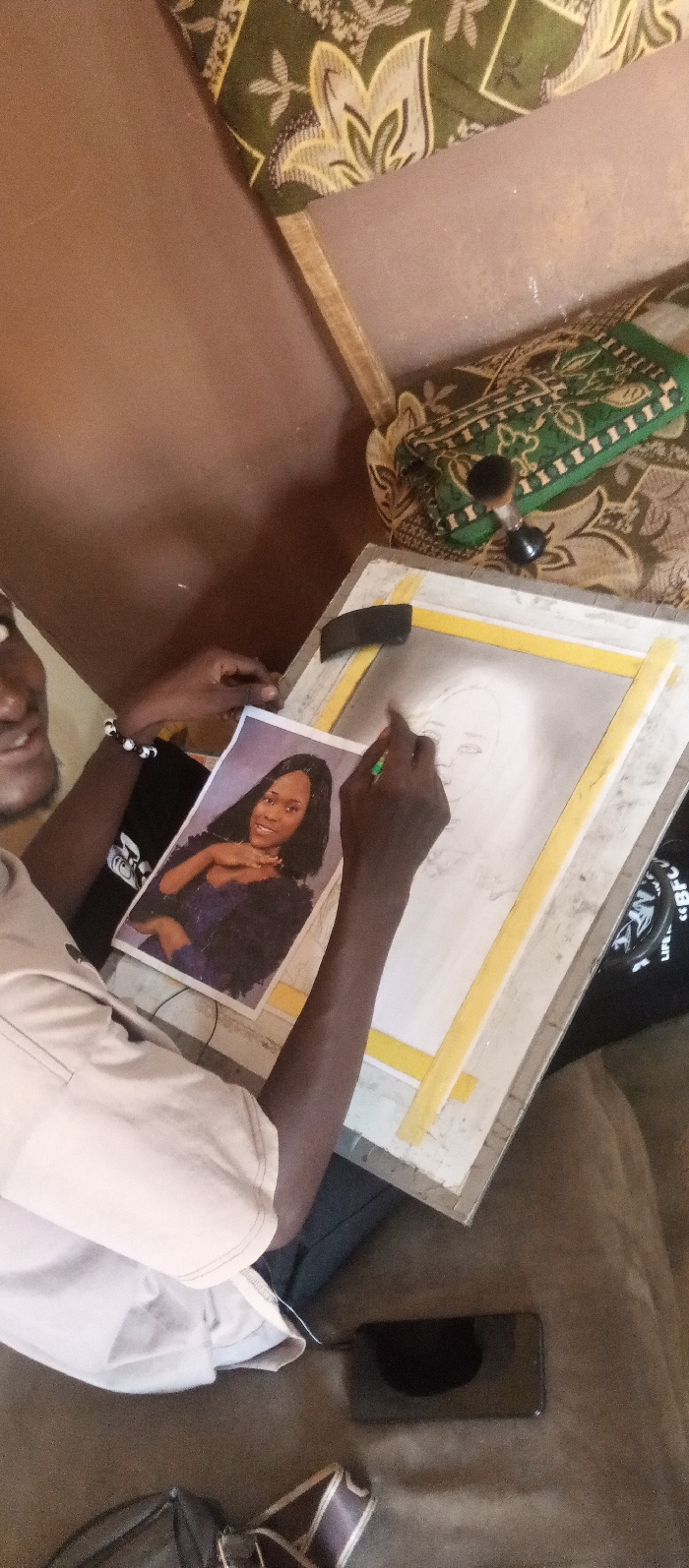 This image depicts an indoor scene in Akwanga, Nigeria. A dark-skinned individual is shown from a high-angle perspective, engaged in drawing a portrait. The individual's partially visible face, on the left, exhibits a slight smile. Their right hand, holding a green drawing implement, is actively working on a white drawing board. The board features a piece of paper secured with yellow tape, on which a partially rendered graphite sketch of a woman's face is visible. A black eraser and a blending brush are also present on the drawing surface. The individual's left hand holds a color printout of a smiling dark-skinned woman with long dark hair, serving as a reference image. The person wears a light-colored short-sleeved shirt and a black beaded bracelet on their left wrist. The background features a plain dark brown wall. To the upper right, a green and beige patterned fabric object is visible, with a small brush resting on it. A black smartphone with a dark screen and a segment of a brown and white fabric strap are situated on a brown upholstered surface in the lower right foreground.