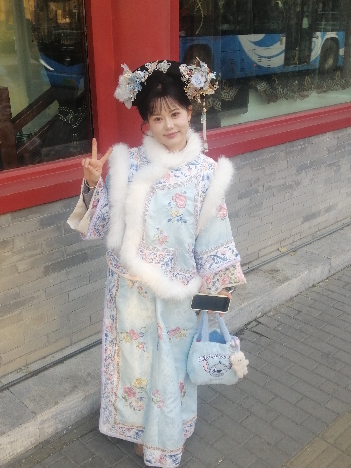 A female individual stands on a paved sidewalk in Dongcheng District, China, positioned next to a building facade. She is dressed in a light blue traditional Chinese-style ensemble, comprising a patterned top with white fur trim around the collar and opening, and a matching long skirt, both featuring intricate floral embroidery in pastel colors. Her dark hair is styled in an elaborate updo adorned with multiple decorative hairpins, combs, and floral elements in blue, white, and gold. The subject faces the camera with a slight smile, extending her left hand in a peace sign gesture. Her right hand holds a white-cased smartphone upright, and her right arm carries a light blue plush handbag embroidered with "weird but" and a character resembling Stitch, to which a small, light-colored plush keychain is attached. The background consists of a building with a gray brick base, a prominent red horizontal beam above the brickwork, and a large reflective glass window. The window's reflection displays two blue and white units, possibly air conditioning units, and dark, patterned fabric. The ground is composed of light-colored interlocking pavers.