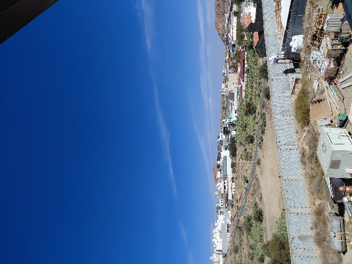 A vertically oriented aerial shot shows a vibrant blue sky dominating the left side of the frame. Moving right, a sparse landscape reveals a small town or village nestled along a path or road. Buildings of varying sizes are visible. Further right, an area under construction is apparent, with building materials scattered amongst dry vegetation. The horizon is obscured by the landscape, emphasizing the contrast between the urban/construction area and the vast sky.