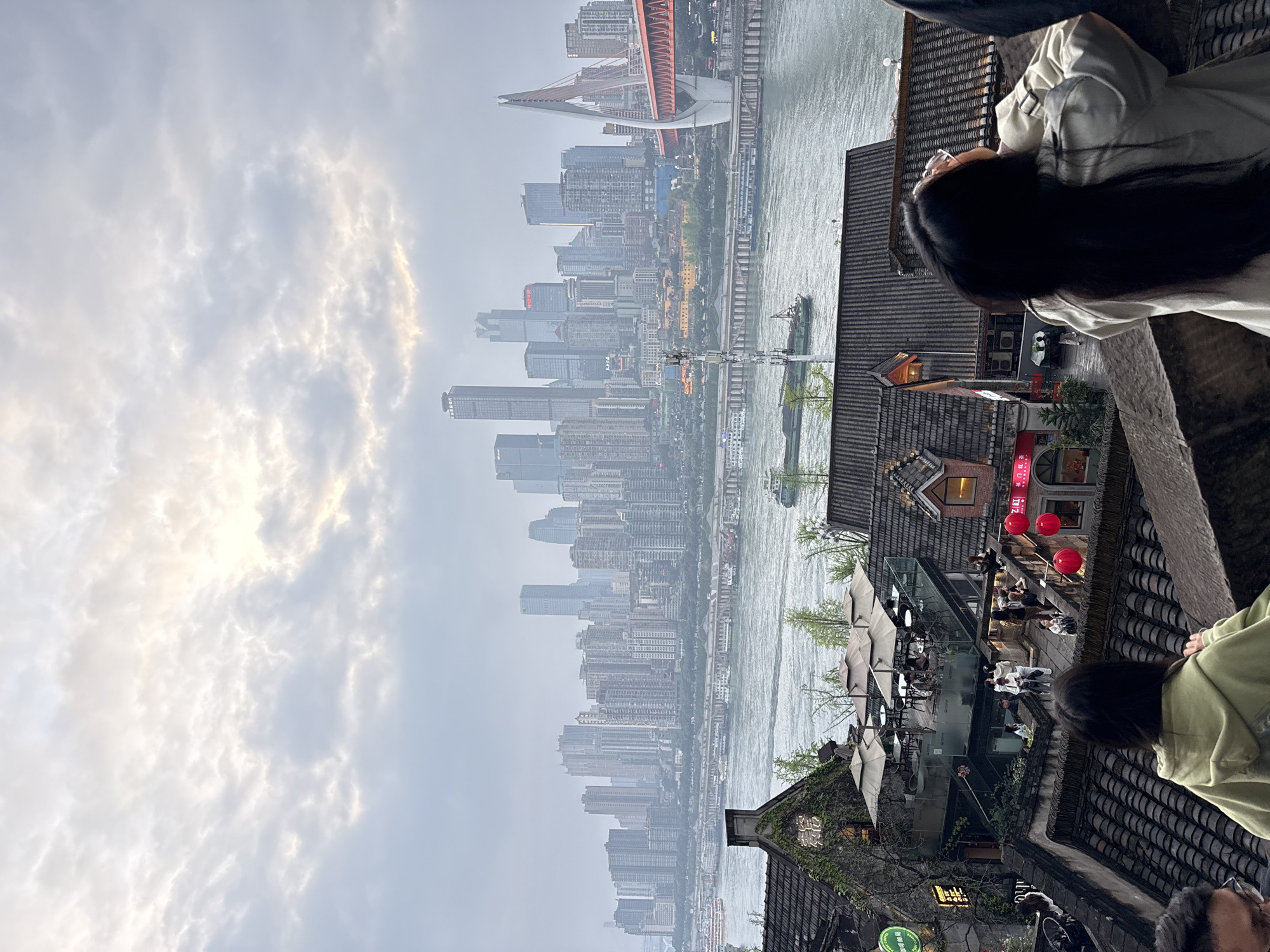 The image depicts an elevated panoramic view from Nan'an District, Chongqing, China, looking across the Yangtze River towards the densely populated Yuzhong District under an overcast sky. The sky is uniformly grey and cloudy, with diffused light evident in subtle brighter patches. In the background, a sprawling cityscape of numerous tall, modern skyscrapers and high-rise residential buildings is visible on the opposite riverbank, partially obscured by atmospheric haze. To the right, a prominent red cable-stayed bridge, featuring a distinctive white A-frame support tower, spans the wide river. Closer to the far bank, a lower, multi-level bridge structure is also apparent. The wide body of water, identified as the Yangtze River, shows ripples on its surface. Multiple barges and smaller vessels navigate the river, with two notable barges positioned in the mid-distance on the left and center-right respectively. A tall cellular communication tower stands on the near bank's edge in the midground. In the foreground, a series of traditional-style Chinese buildings with dark tiled roofs and some exposed wooden elements are terraced down a hillside. One building features an extensive rooftop dining area equipped with multiple light-colored umbrellas and glass perimeter railings. Another building displays illuminated Chinese characters on its facade and three prominent red spherical lanterns hanging near an entrance. Green foliage, including vines climbing buildings and small trees, is interspersed among the structures. Three individuals are prominent in the immediate foreground, seen from behind, facing away from the camera and observing the distant cityscape. The person on the right has long dark hair and wears a light-colored jacket. To their left, another individual wears a light green hooded sweatshirt. A third person's head is partially visible on the far left. Numerous other individuals are scattered on the lower terraces, either seated at outdoor tables on patios or walking along pathways between the buildings.