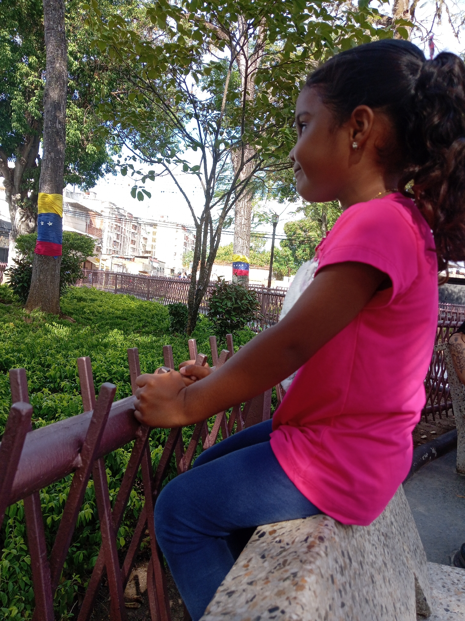 A young girl is seated sideways on a light-colored, speckled concrete bench in a public park in Parroquia Ocumare, Venezuela. Positioned in the lower-right foreground, she faces right with a slight smile. Her dark, curly hair is styled in a high ponytail, and she is dressed in a bright pink short-sleeved t-shirt, blue pants, and small white stud earrings. Her hands are rested together atop a dark brown metal fence, featuring a diamond-lattice design, which extends across the mid-ground. Beyond the fence lies an area of dense green foliage. To the left, a tree trunk is adorned with fabric in the colors and stars of the Venezuelan flag. In the background, multiple trees are visible, along with urban multi-story buildings and a dark street lamp. A partial view of another person's leg and arm is visible on the far right. The scene is brightly illuminated by natural sunlight.