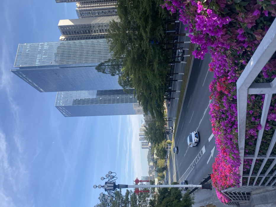 A cityscape view features modern glass skyscrapers against a blue sky. A road lined with green trees and vibrant purple bougainvillea runs alongside. A white car is visible on the road. In the foreground, a grey railing and decorative lamppost add depth. Distant buildings fade into the horizon.