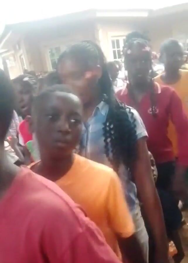 crowd of people walking and moving forward, presumably in an outdoor setting. The majority of individuals appear to be younger, potentially students, with some wearing what might be school uniforms, indicated by consistent colors and possibly logos. They are dressed in various colors, including red, orange, and blue. The movement of the crowd appears dynamic, with people partially obscuring each other. The background includes a building with windows and a light-colored exterior. The overall impression is that of a spontaneous gathering, perhaps a procession or departure from a location. The recording is somewhat shaky.