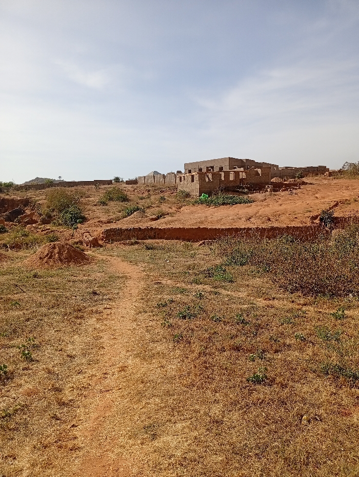 The image captures an arid, undeveloped landscape in Kwang, Nigeria, under a partly cloudy sky. A narrow dirt path originates from the bottom center, traversing reddish-brown soil sparsely covered with light brown dried grass and scattered small green shrubs, leading towards the midground. To the left of the path, a small mound of reddish earth is visible. The midground slopes gently upwards, dominated by multiple single-story structures in various stages of incomplete construction. These buildings are constructed from grey concrete blocks, lacking roofs, doors, and windows, with exposed blockwork defining openings. The most prominent structure, situated to the right, displays multiple room outlines. The ground surrounding these construction sites consists of disturbed reddish-brown soil and sporadic green vegetation. The background reveals additional distant, incomplete block structures and a low horizon line under the light blue sky. No individuals are present in the scene.
