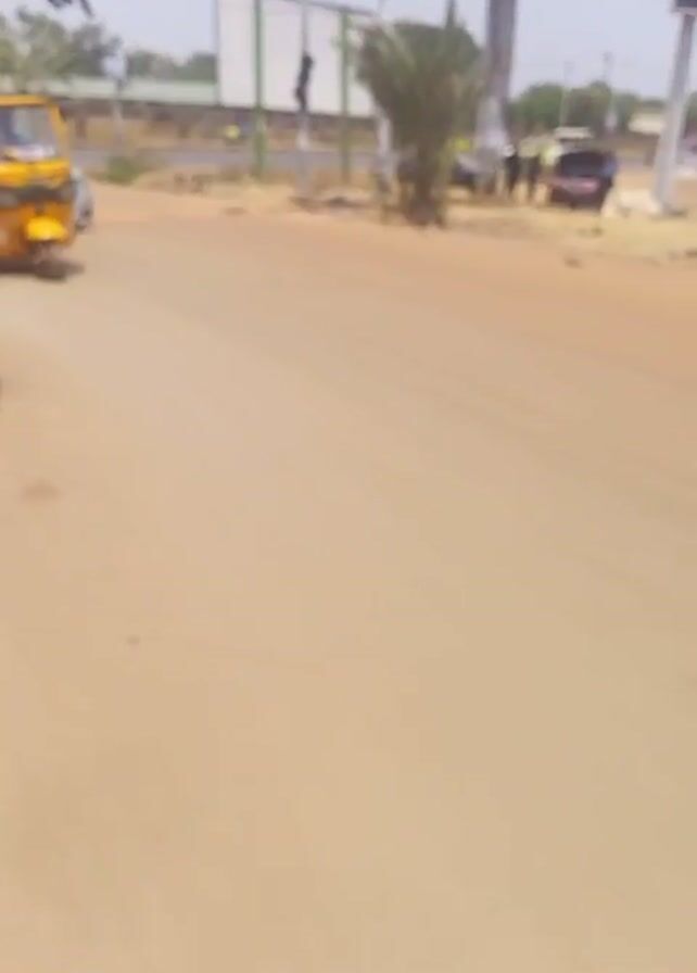 street scene on a sunny day. The road is made of sand and dirt, and the sky is a bright, clear blue. Several vehicles are visible, including a yellow three-wheeled auto rickshaw and a black motorcycle. A man wearing a dark shirt and a hat is sitting on the motorcycle. Other people are visible in the background and standing near the side of the road. Traffic lights stand tall at the intersection. The scene appears to be in a less-developed area, with dirt roads and sparse vegetation.