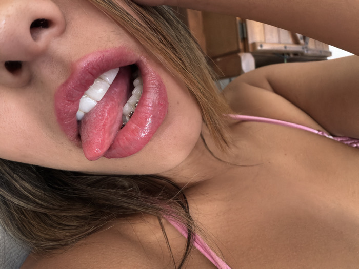 A close-up captures a person's face from below, highlighting their open mouth with their tongue extended. Visible teeth and lip color suggest a woman, while a pink spaghetti strap indicates clothing. The surrounding skin is smooth and warm-toned. Part of her hair is also visible.