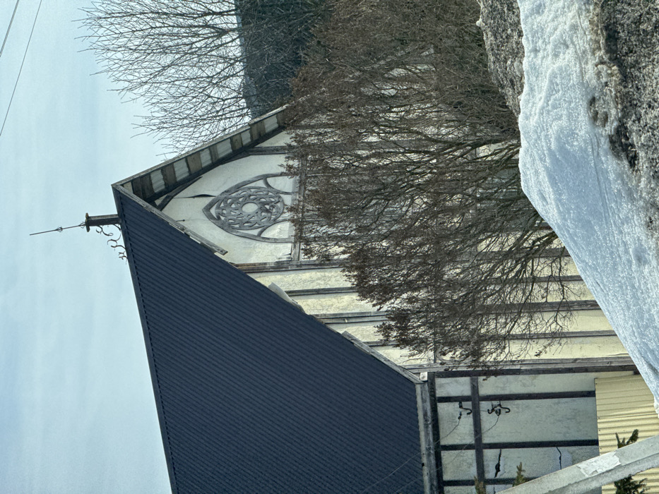 The image displays the exterior of a building located in the city of Кварса, Russia, under a pale blue sky. The central subject is the steep gable-end section of a structure, featuring a dark blue corrugated metal roof. A slender metal rod, likely an antenna or lightning rod, extends vertically from the roof's peak, positioned above a decorative black metal finial. The upper facade of the gable is constructed from a light-colored material, possibly stucco or plaster, with prominent dark timber framing. A circular decorative window, characterized by an intricate radial spoke pattern, is centrally placed within the gable. Cracking is visible in the facade directly above this window. The lower portion of the building's wall, partially visible on the left, maintains the light-colored finish and dark timber framing, and displays several dark metal hooks. A dense cluster of leafless deciduous trees and bushes partially obstructs the building's mid-section. In the immediate foreground, a mound of snow mixed with dark earth is present. A segment of a yellow corrugated metal fence and a white utility pole structure are visible on the far left.