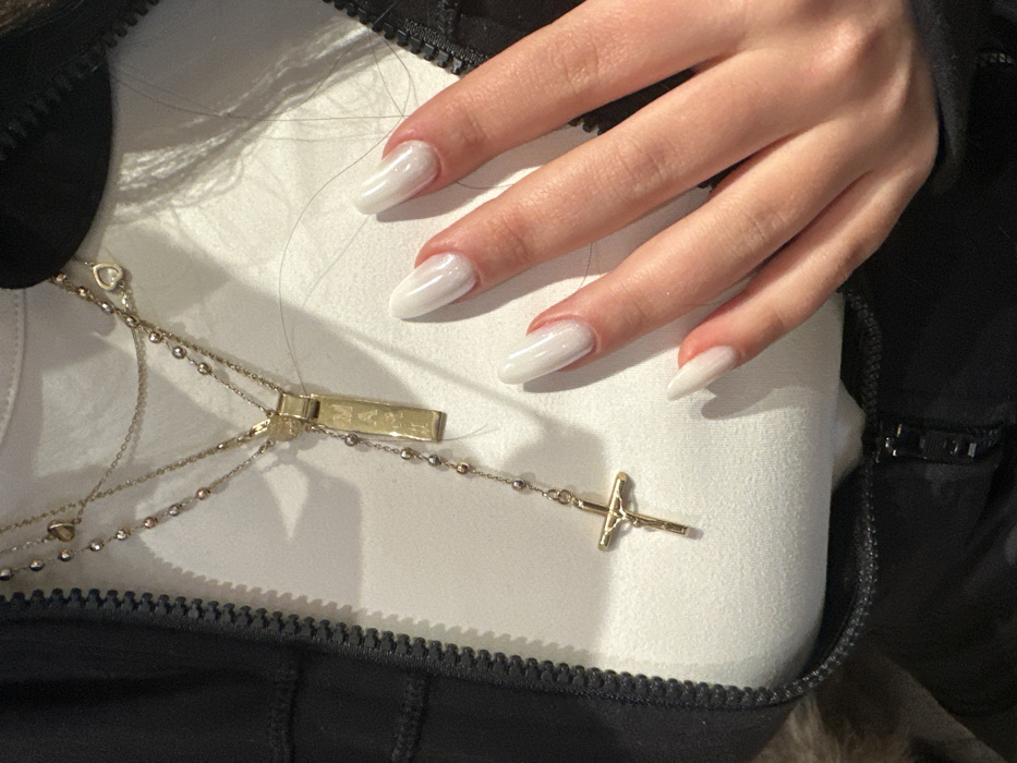 A fair-skinned hand with long, white, almond-shaped nails rests on a white fabric surface