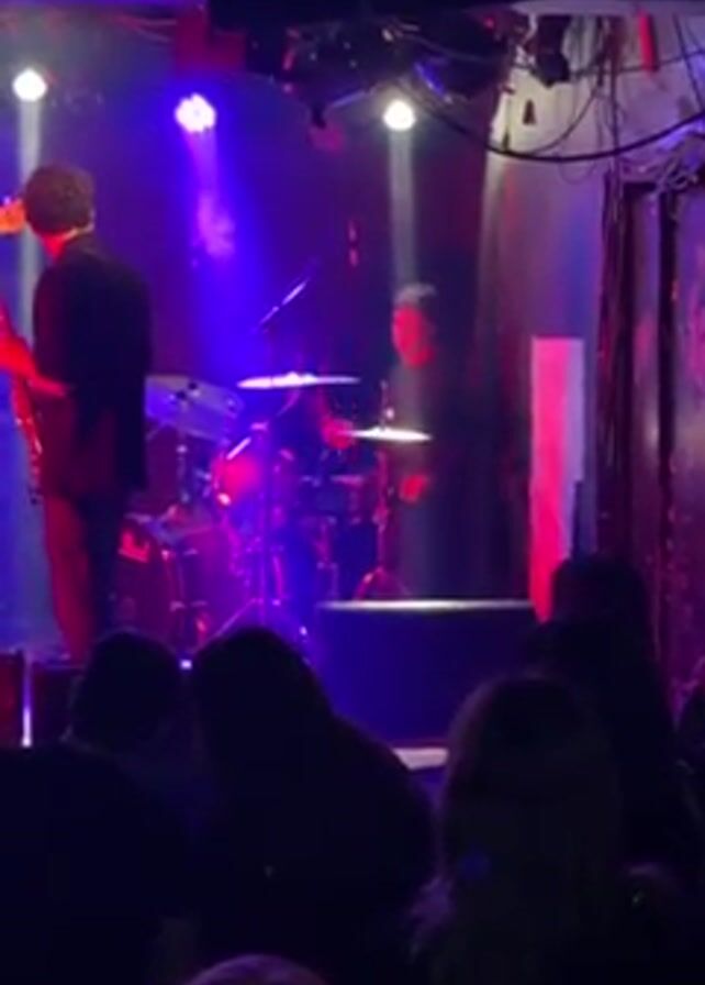 A dimly lit music venue is hosting a live performance. The stage is awash in purple and red light, illuminating a saxophonist on the left and a drummer in the center. The saxophonist stands with his back to the camera, his instrument reflecting the colored lights. The drummer, positioned behind a drum kit, is captured mid-performance. Stage lights and sound equipment are visible above and behind the performers. In the foreground, a crowd of spectators is silhouetted against the stage lights, their faces indistinct. The venue appears intimate, with limited space between the audience and the stage.