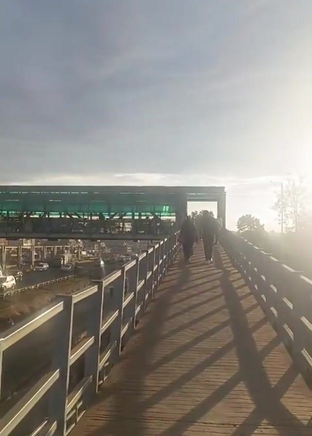 pedestrian bridge with two people walking on it. The bridge is made of wood and has metal railings. Below the bridge is a road with cars and buses. There is also a building to the left, possibly a terminal, with many cars parked nearby. The sky is overcast and the sun is shining brightly in the background. The video is taken from the perspective of someone walking on the bridge.