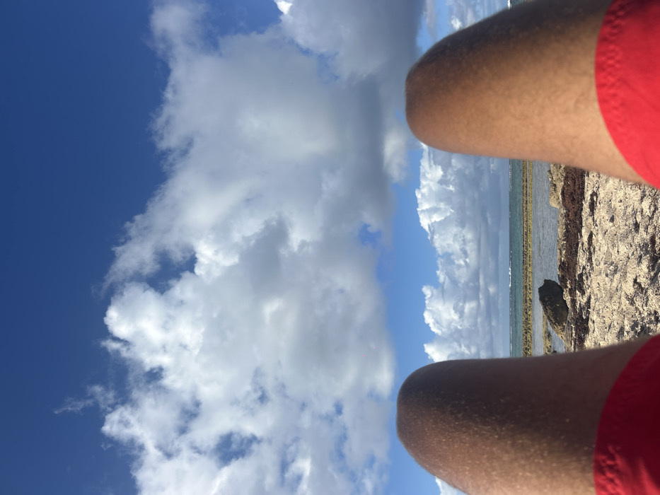 The image depicts a first-person perspective from a supine position on a sandy beach in Le Moule, France. Two human legs, bare and tanned, extend into the lower foreground, partially covered by red swim shorts. Immediately beyond the legs, the environment consists of light brown sand mixed with dark brown seaweed and scattered rocks. Further into the midground, shallow, clear ocean water is visible, with a rocky reef or seabed beneath the surface. In the background, the open ocean shows moderate wave activity, with waves breaking on a distant barrier reef or shore. The upper two-thirds of the image features a bright blue sky with numerous large, white cumulus clouds distributed horizontally across the frame.