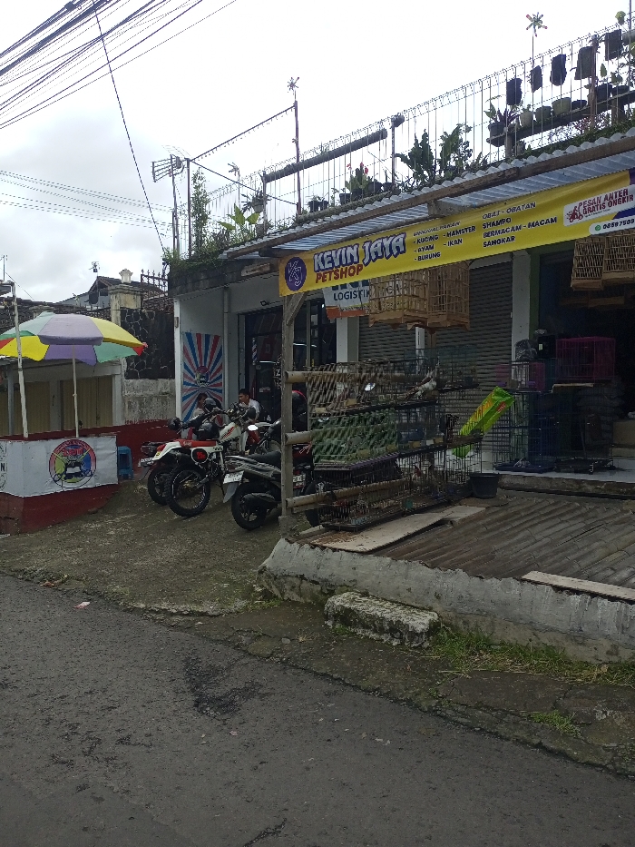 This image depicts a street-level commercial scene in what is identified as the city of Meyong, India. The foreground features a dark asphalt road with visible cracks, transitioning to a lighter dirt and gravel area. Along the right edge of the road, a low, rough concrete curb separates the street from a raised section. The primary focus is a two-story building housing two businesses. On the left, a barbershop is identifiable by a red, white, and blue striped mural on its exterior wall. Inside, two males are present: one seated to the left, and another standing further back. To the right of the barbershop is the "KEVIN JAYA PETSHOP," marked by a prominent yellow banner displaying text in Indonesian, listing products like animal food, medicine, shampoo, and various animals including cats, hamsters, chickens, fish, and birds, along with an offer for free delivery. The pet shop's entrance is open, revealing a corrugated metal roll-up door. Outside the pet shop, numerous animal cages, primarily bird cages, are displayed. Some hang from a corrugated metal awning extending from the building, while others are stacked on metal racks. A green, tiered display rack holding multiple items is also visible. Four motorcycles are parked on the dirt area in front of the shops; two are dirt bike models, one is a scooter, and a fourth is partially obscured. To the far left of the scene, a white, rectangular stall-like structure with red trim and a circular logo is present, covered by a colorful umbrella featuring yellow, green, and purple sections. The upper level of the building, above the shops, features a metal railing from which several potted plants and small wind spinners are visible. Overhead, multiple utility lines crisscross the cloudy, overcast sky.