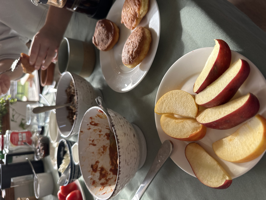 The image depicts an indoor meal setting on a light green tablecloth in Sighnaghi, Georgia. In the foreground, a white plate holds multiple slices of red and yellow apples. To its right, an oval white plate contains three golden-brown, oval-shaped fried pastries. A textured white bowl in the center foreground contains reddish remnants of a dish, with a silver spoon resting inside. Behind it, various bowls are arranged, including one with white crumbly cheese, one with whole red tomatoes, another with dark preserves, and a small white bowl of sugar. A bowl of cereal or granola is also visible. In the upper right quadrant, a person's hands are actively using a spoon to interact with one of the pastries. Other objects on the table include a dark bottle, a two-tone green and beige ceramic mug, and a clear glass of water. Natural light illuminates the scene from the right, casting soft shadows.