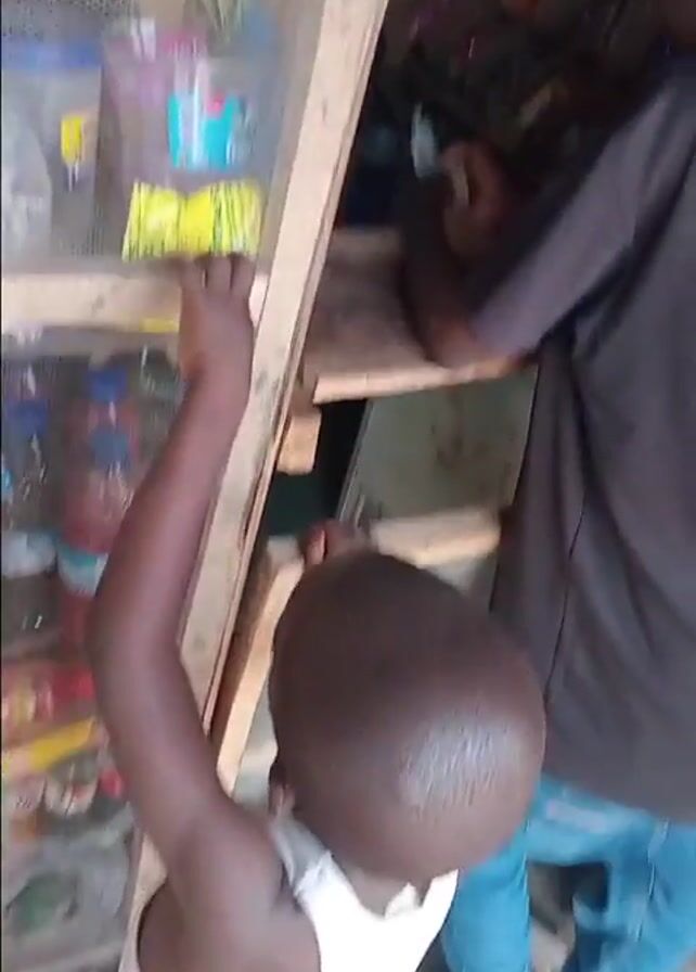 A young, dark-skinned child in a white tank top and patterned shorts reaches up to a wire mesh-covered wooden shelf unit stocked with items. The shelves contain plastic containers with lids, packaged food items, and bottles. Behind the child, an adult in a dark shirt and blue jeans stands near a wooden shelf, partially visible. The environment appears to be an outdoor vendor or shop.