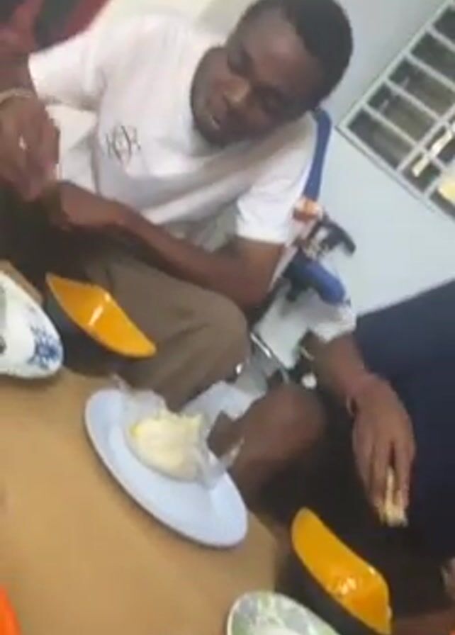 four people sitting around a table eating a meal. Each person has a plate with a white, doughy food substance on it and a separate bowl with a stew-like sauce. They are using their hands to eat the meal, breaking off pieces of the doughy food and dipping it into the sauce. The table is a light brown color, and the surrounding environment appears to be a casual living space. One person is wearing a white t-shirt with a symbol on it, another is wearing a dark blue t-shirt, and a third is wearing a bright pink shirt. There are also empty plastic bags on the table, presumably from the food.
