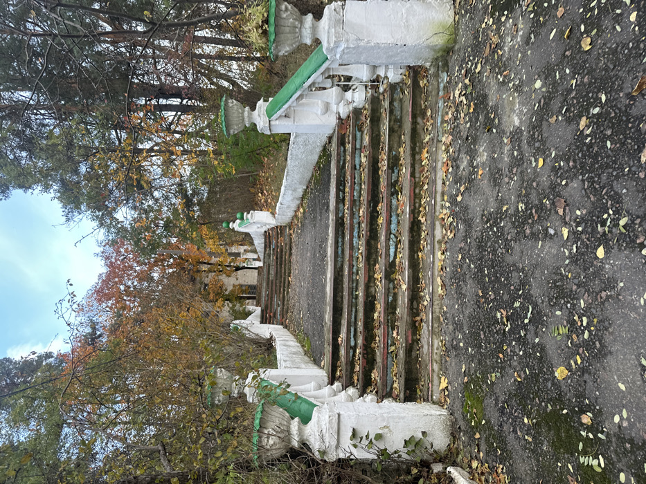 The image depicts a decaying multi-tiered concrete staircase ascending through a wooded area in Irpin, Ukraine