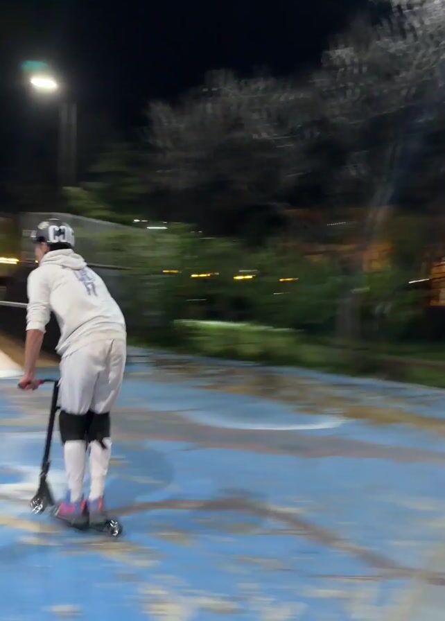 - "At night, a person dressed in white clothing and wearing a helmet rides a scooter up a ramp at a skate park" by FM-Q1XvS2, licensed under CC BY 4.0