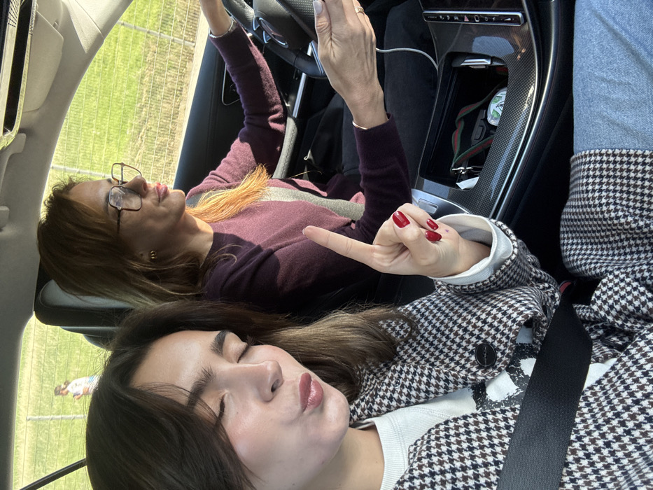 The scene is set inside a vehicle in Loures, Portugal. Two females are present. In the left foreground, a younger female passenger is depicted from the chest up. She has brown hair and is wearing a white top under a brown and white houndstooth pattern jacket. Her eyes are closed, and her lips are pursed in a "kiss" gesture. Her left hand, with red painted nails, is raised, index finger pointing upwards. A black seatbelt is buckled across her chest and lap. Light blue denim jeans are visible below her jacket. To the right and slightly behind, an older female drives the vehicle. She has light brown hair, wears square-framed glasses, a dark purple long-sleeved sweater with a gray seatbelt visible diagonally across her torso, and dark pants. Her right hand is on the black steering wheel, which features a Mercedes-Benz logo, and her left hand rests below it, holding a white charging cable. Her gaze is directed forward. Strong sunlight illuminates the driver's side of the car. Between the occupants, a central console with a touchscreen display and glossy black surfaces is visible. An open compartment on the console contains various items, including a green and red striped strap and keys. Through the passenger window, a green grassy area with a wire fence is visible, and a blurred figure of a person is walking in the distance.