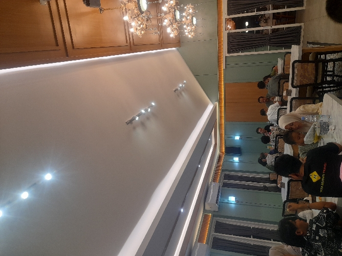 This image depicts the interior of a dining establishment located in Kecamatan Pati, Indonesia. Approximately 15 to 20 individuals are observed seated at tables. The setting features a high, sloped ceiling, predominantly white, equipped with recessed spotlights and linear strip lighting. A portion of the ceiling transitions into a wood-paneled wall on the right, from which two ornate, multi-tiered chandeliers with numerous lights and decorative elements are suspended. The side walls are painted a light teal or mint green, accented with dark wooden trim and vertical paneling. Dark grey curtains cover window or door openings on both sides. The furniture consists of rectangular white marble-top tables and dark wooden chairs with woven cane backs. In the foreground left, a person in a black and white patterned shirt is seated. Adjacent, a person wears a black t-shirt with a yellow logo that reads "MITRA MEKARTI TRAVEL." To their right, a woman wearing a light-colored hijab is seated across from a child, with both individuals looking down at an item on their table. A clear plastic bottle of water is present on this table. Further into the background, other patrons are seated at various tables, engaged in dining and social interaction. An air conditioning unit is mounted on the upper section of the left wall.