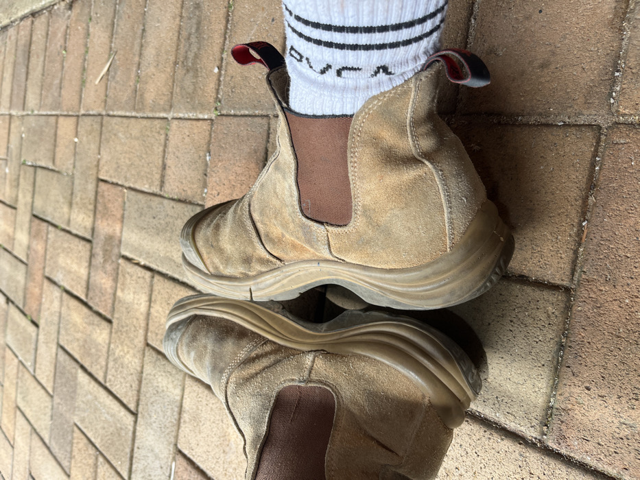 - "A pair of tan work boots, likely made of suede or a similar material, sit atop a brick surface" by FM-R1zri2, licensed under CC BY 4.0