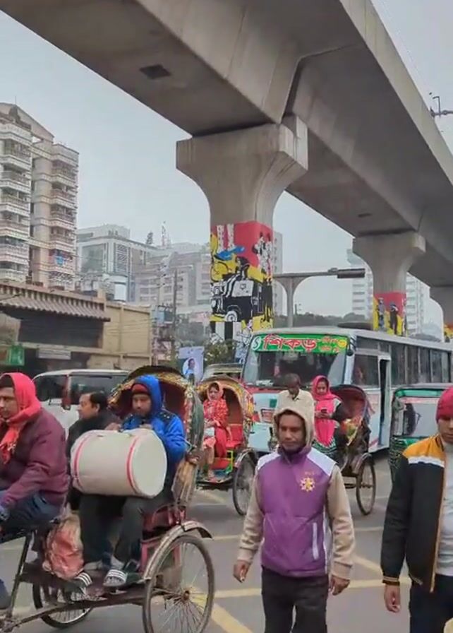 busy street scene in Dhaka, Bangladesh. Several cycle rickshaws, some carrying passengers, are visible on the street. In the background, there is a elevated metro rail line structure. Pedestrians are walking on the street, including a man in a purple vest and another in a red knit hat. Traffic includes a motorcycle, buses, and vans. A large building and a minaret are visible in the background.