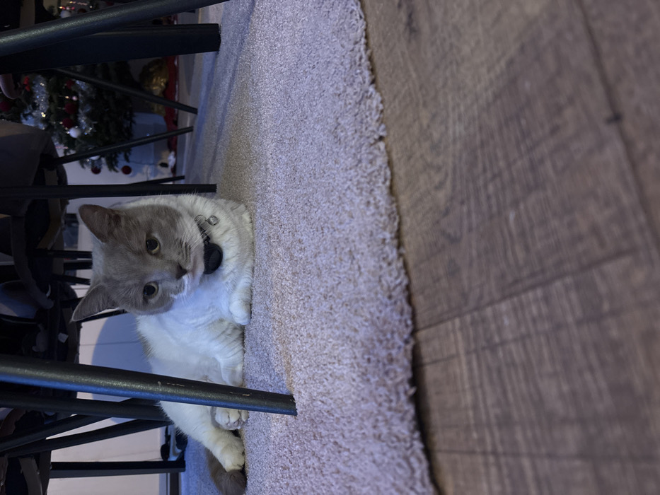 A cat with gray fur on its head and white fur on its body lies on a light-colored, textured carpet. The cat wears a collar with a black tag. Black table legs are visible around the cat. To the left of the cat is a Christmas tree, partly visible behind the table. To the right of the carpet is a dark brown hardwood floor.