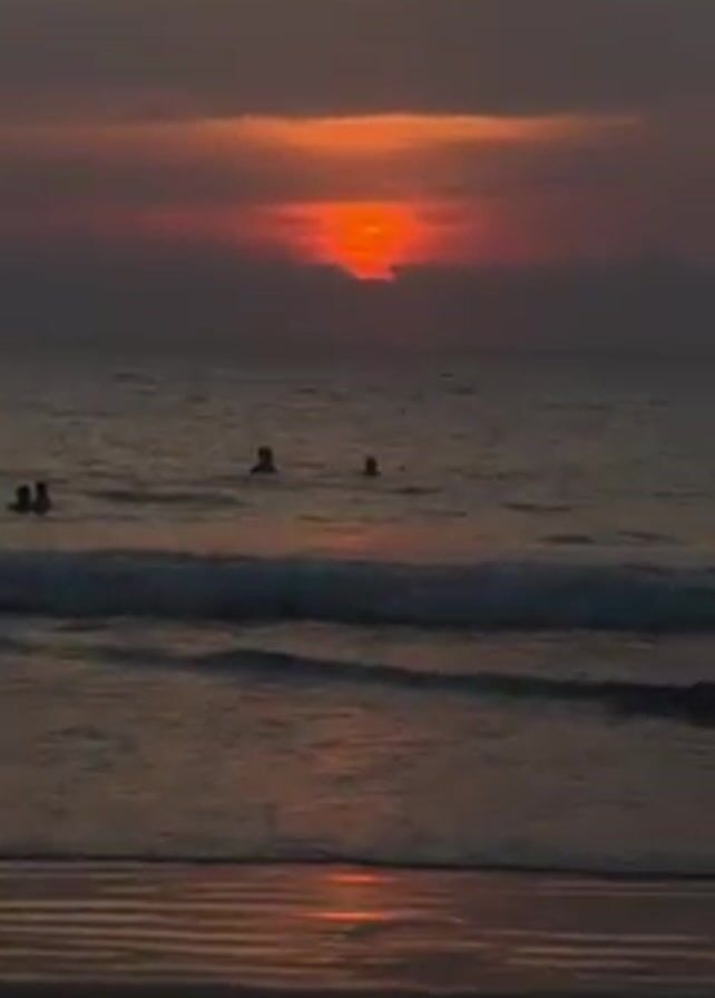 beach at sunset. The sun is partially obscured by clouds, creating a reddish-orange glow. The ocean waves are small, and there are several people swimming in the water. The beach is dark, and the wet sand reflects the light from the sunset.