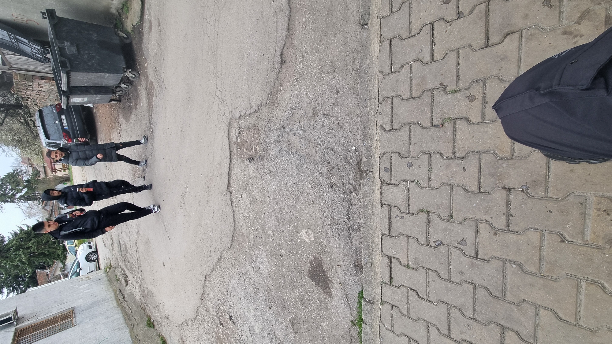 The scene depicts a residential street in Dolni Chiflik, Bulgaria, under an overcast sky. Three young males are walking from the mid-ground towards the viewer on a worn asphalt road. The leftmost male wears a black tracksuit and white sneakers, holding a red can in his right hand. The middle male wears a black hooded jacket, black pants, and dark shoes, holding a black can with a red label in his right hand. The rightmost male wears a grey puffer jacket, dark pants, and light-colored sneakers, holding a black can with a red label in his left hand. All three appear to be engaged in a casual stroll. To the immediate left in the background stands a light-colored building with a visible window. A white car and a dark sedan are parked further down the street on the left. To the right in the background, two large, dark-colored wheeled dumpsters are positioned alongside a wooden fence and a stone wall. Behind these objects, a dark BMW SUV (Bulgarian license plate B 2128 TE) is parked. Sparse trees with some light foliage are visible beyond the buildings and vehicles. The foreground consists of a grey paved sidewalk made of interlocking I-shaped concrete blocks. A portion of a dark-clad leg and dark shoe belonging to the individual taking the photograph is visible in the lower right corner, suggesting a low vantage point. The asphalt road surface exhibits various cracks, patches, and small depressions.