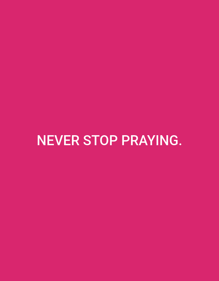 The image displays a digital graphic featuring white, capitalized sans-serif text stating "NEVER STOP PRAYING