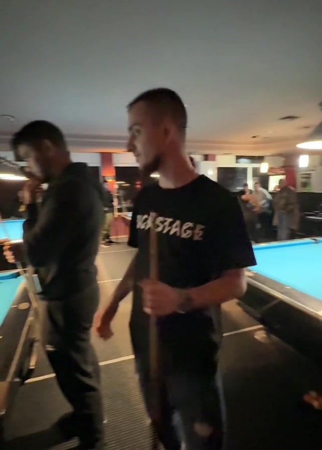 interior of a billiard hall. Several pool tables with light blue felt are visible, along with people playing or watching. The lighting is moderate, with overhead lamps illuminating the tables. One person is wearing a black t-shirt with "BACKSTAGE" printed on it. Another person is wearing a pink shirt. Some people are standing, and some are seated. There's a bar area visible in the background. The camera moves slightly, showing more of the hall's interior.