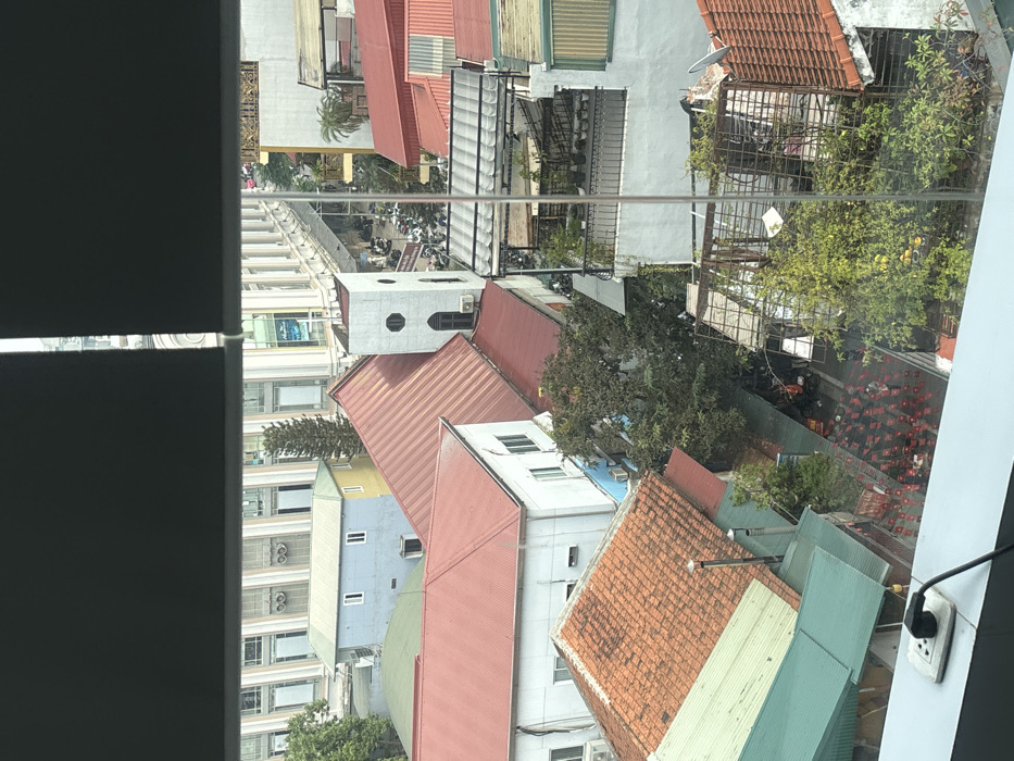 An aerial view captures a dense neighborhood with buildings of varying heights and architectural styles. Predominantly red-tiled roofs contrast with white and light-colored structures. Trees and vegetation intersperse throughout, partially obscuring the narrow streets below. A taller, modern building is visible on the left. The overall scene suggests a tightly-packed urban environment.