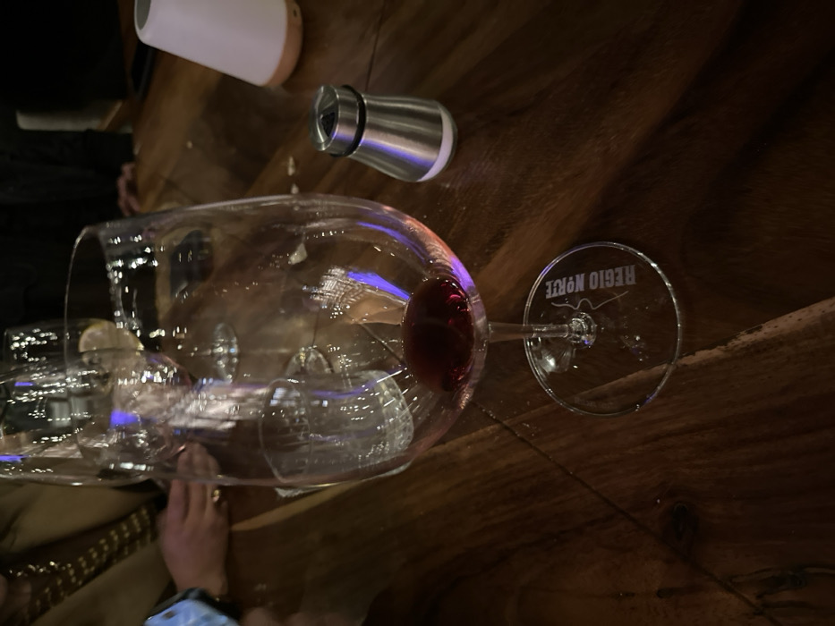 A large wine glass containing a small amount of red wine rests on its side, next to smaller glasses. A stainless steel shaker and a white cylindrical object are nearby. The table appears to be made of dark wood. A woman's bare foot is partially visible in the lower left corner of the frame. The brand name "REGIO NORTE" is visible on the base of the wine glass.