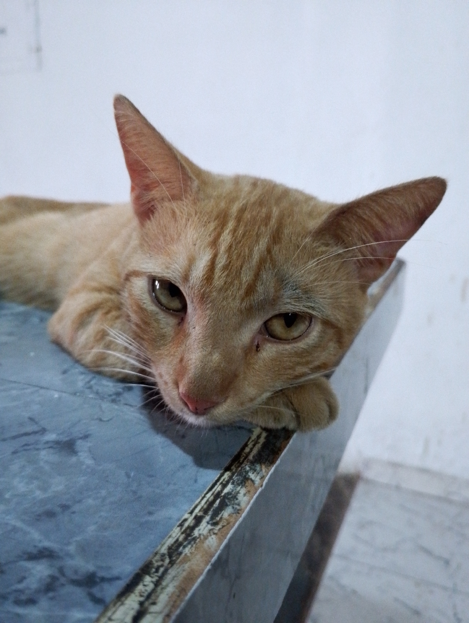 - "An orange tabby cat is lying on a blue and gray surface, possibly a table or shelf" by FM-fU3YD2, licensed under CC BY 4.0