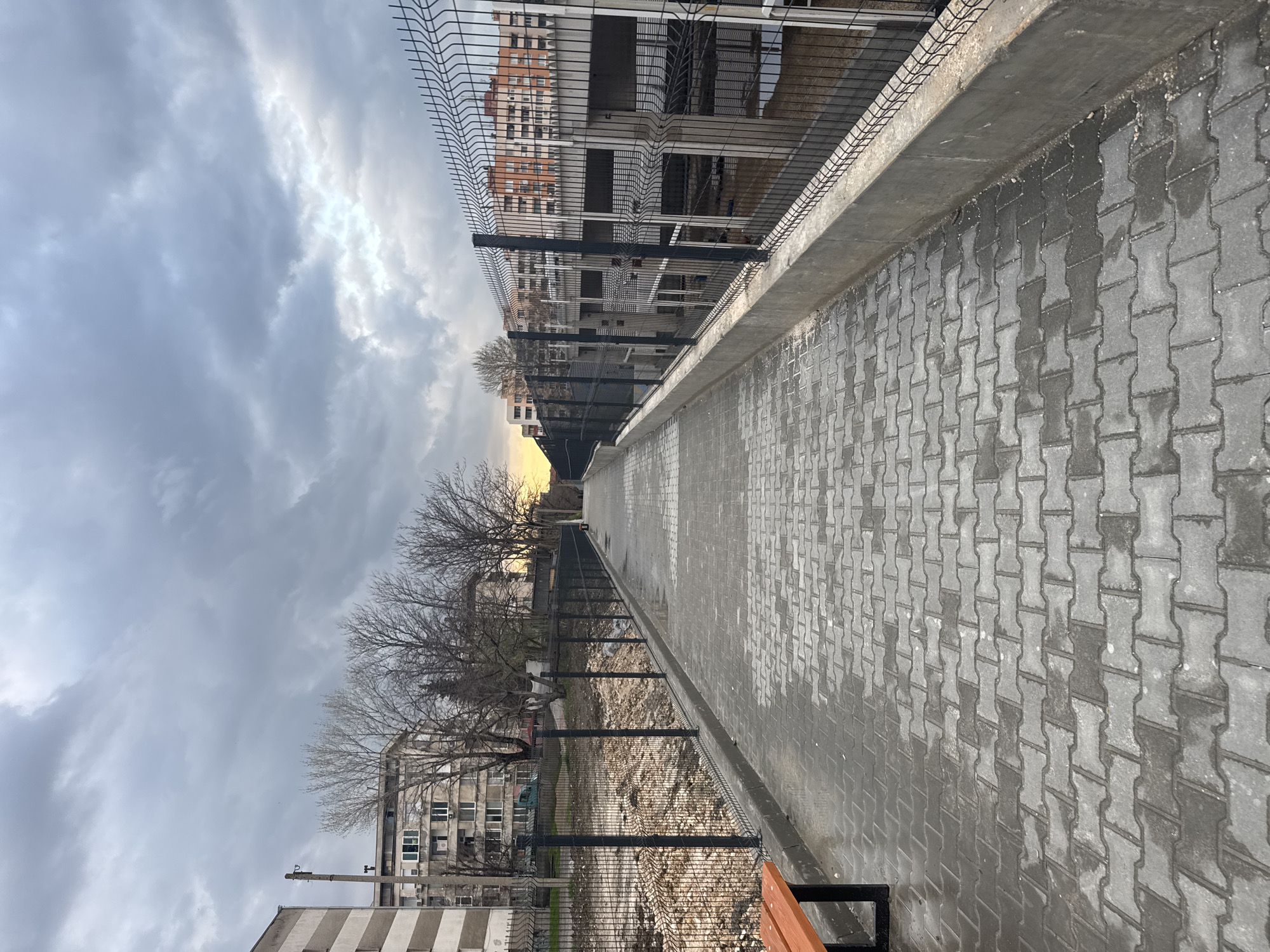 The image presents a perspective shot of a pathway lined with gray paving stones, running between two fences. The right fence is topped with a concrete beam. A building under construction, with exposed steel structures, stands behind the right fence. Behind the left fence is a weedy, barren area with a utility pole and a drab, multi-story building. The sky is overcast with dramatic cloud formations. A hint of golden light is visible on the horizon. The photo appears to be taken in a city environment, though precise location details within Asenovgrad, Bulgaria are not discernible.