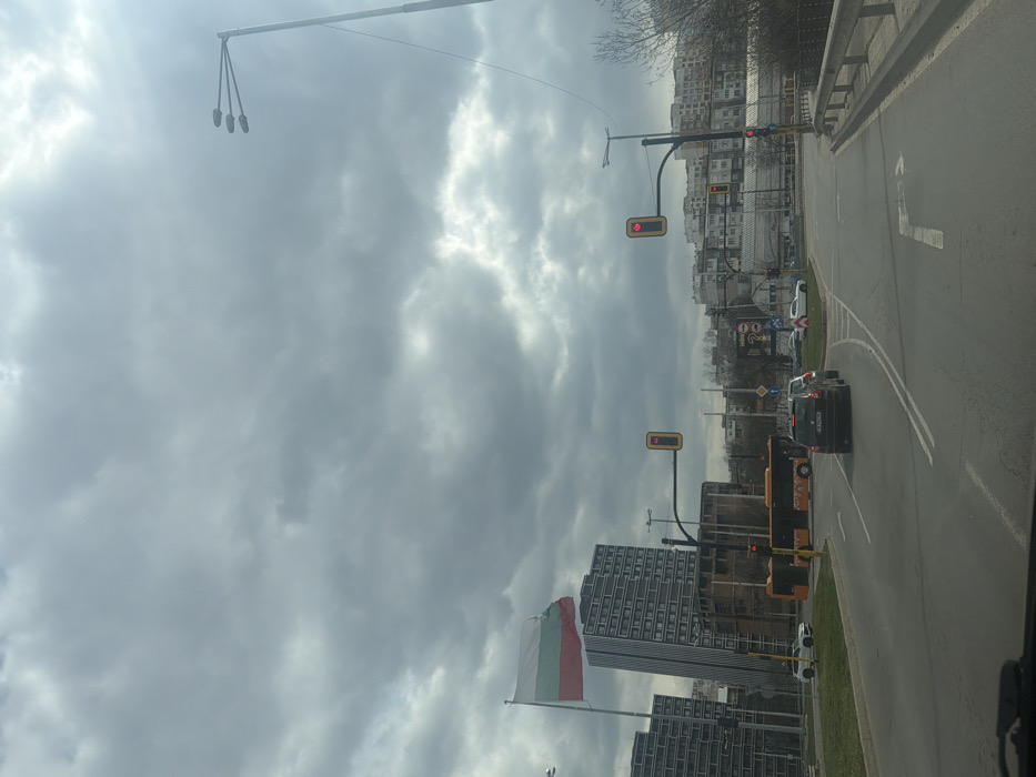 The image presents an urban street scene in Sofia, Bulgaria, specifically at the intersection on Tsarigradsko Shose Boulevard, facing east towards the Capital Fort complex. The sky is heavily overcast with dense, grey clouds. From a low vantage point within a vehicle, a multi-lane asphalt road with white lane markings is visible in the foreground and mid-ground. Directly ahead, a dark-colored SUV is stopped in a traffic lane, followed by another dark car. To the left, a white SUV is visible. A long, articulated orange public transit bus occupies the center-left of the intersection, appearing stationary. Multiple traffic light poles display illuminated red signals for vehicular traffic, and a pedestrian signal on the right shows a red standing figure. On the left side of the road, a tall flagpole prominently displays a large Bulgarian national flag (white, green, red horizontal stripes), unfurled by the wind. Behind the flag, two modern, multi-story buildings with dark facades, characteristic of the Capital Fort complex, rise into the sky, with one tower significantly taller than the other. Further right and in the background, a density of older, multi-story residential buildings with varied facades lines the horizon. Sparse, deciduous trees are present with bare branches. A large street light pole with three horizontal arms is visible on the right, next to a concrete barrier or railing suggesting a bridge or overpass. A dark dashboard is partially visible at the bottom of the frame. No individuals are clearly discernible.