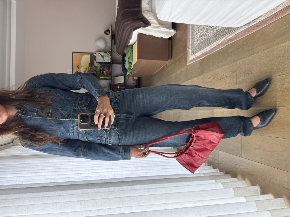 A person wearing a denim jumpsuit, black shoes, and holding a red drawstring bag takes a selfie. The jumpsuit is a faded blue denim with buttons and pockets. The shoes are black leather flats. The bag is a bright red, ruched leather bag with a braided drawstring closure. The person is standing in front of a window with white blinds. There is a bed and furniture in the background.