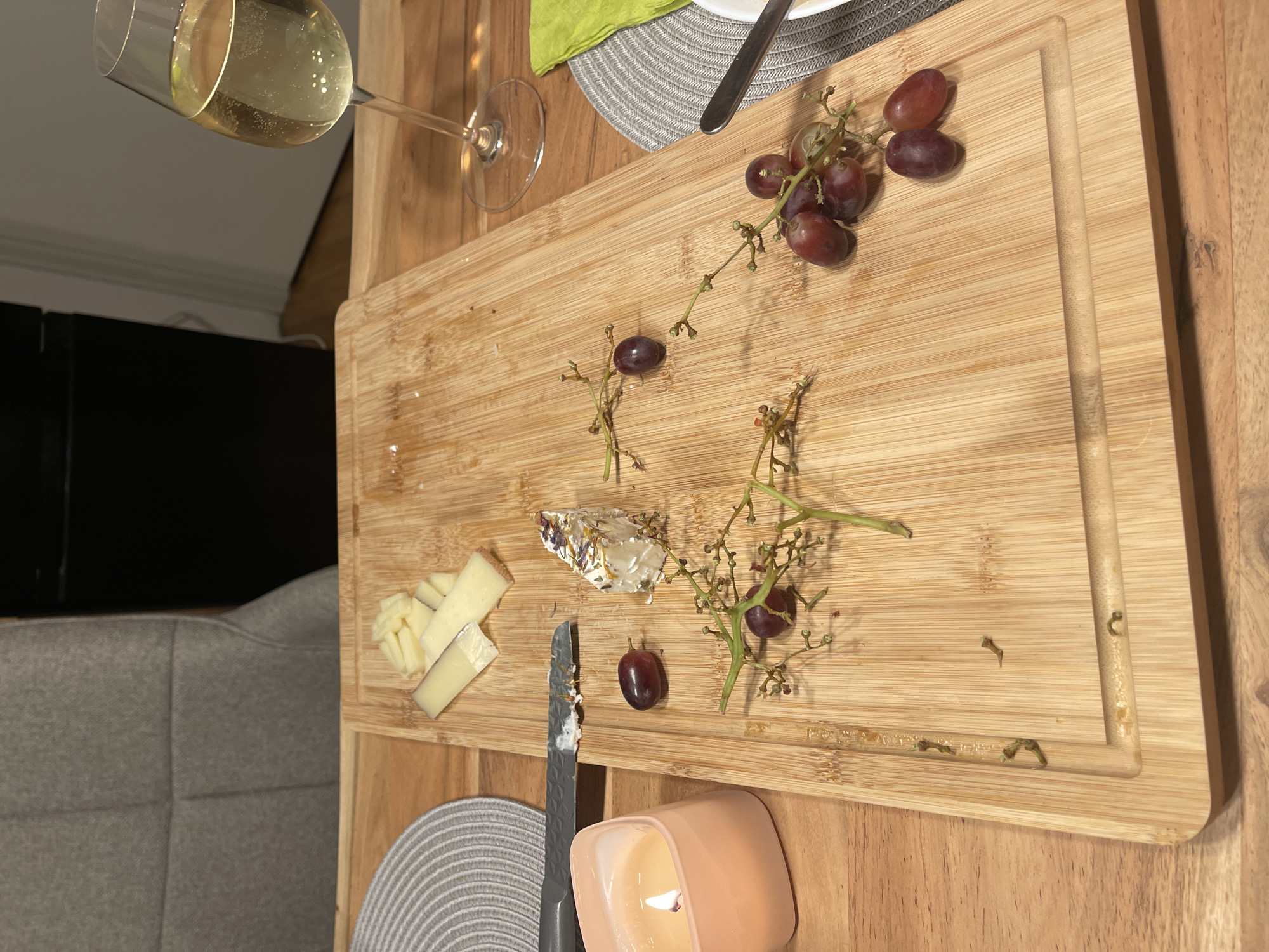 The image depicts a post-consumption scene on a wooden table, likely in a residential setting in Saarbrücken, Germany. A large bamboo cutting board, centrally positioned, holds remnants of a cheese and grape platter. On the board, several slices of yellow hard cheese and one wedge of soft white cheese, garnished with dried herbs or flowers, are present. Scattered across the board are multiple individual red grapes, small clusters of red grapes, and numerous green grape stems, indicative of recent consumption. A gray-handled serrated knife, with white residue on its blade, rests on the left side of the cutting board. To the left, a lit candle in a peach-colored ceramic holder casts a warm light. To the right, a stemmed glass containing a clear, effervescent, light-yellow liquid stands. A gray woven placemat is visible on the left, and another partially visible placemat on the right supports a crumpled lime-green napkin and a silver spoon. In the background, a gray upholstered chair and a dark, possibly black, appliance or piece of furniture are visible, with a light-colored wall and wooden floor further in the distance. No individuals are present in the frame.