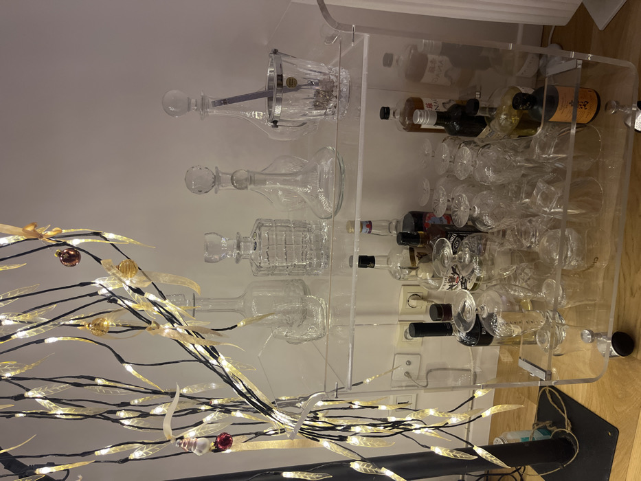 A clear acrylic bar cart displays an array of glass decanters and bottles of alcohol. Wine glasses are stacked neatly on one shelf. A decorative branch with small lights, gold leaves, and ornaments extends from the left side of the frame, partially obscuring the lower shelves. The cart sits on a wooden floor next to a dark-colored object. White walls are visible in the background.