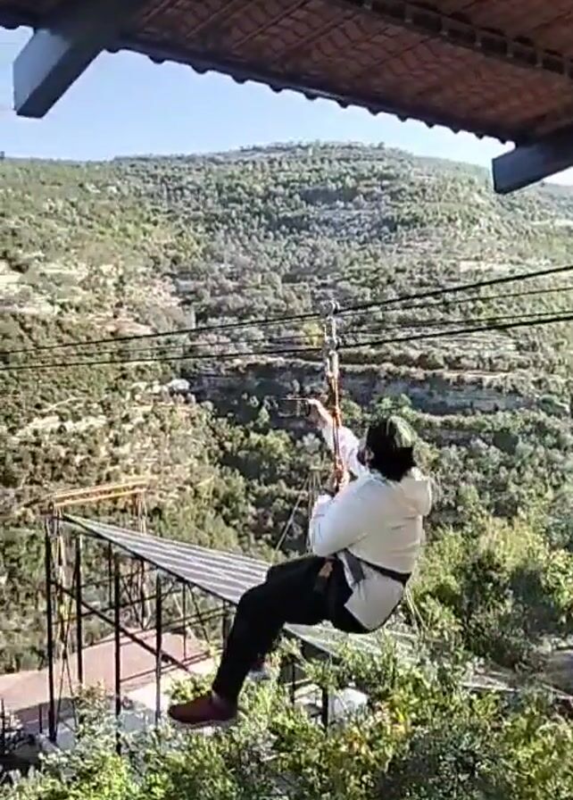 Here is a detailed description of the video: A man on a zipline is moving from right to left in the video. He's wearing a white jacket, dark pants, and red shoes. He appears to be holding a phone in his right hand, possibly recording his experience. The zipline cable is visible, and it's anchored to a metal structure on either side of a green valley covered in trees and shrubs. The camera is positioned under a covered roof, framing the zipline and the man in the distance. The sky is clear and blue. Another person wearing a blue sleeve is partly visible to the right of the person on the zipline. A voice can be heard, saying "Bismillah Al-Atlal, Bravo Ahmad, on the wadi, not on your mobile, Bravo."