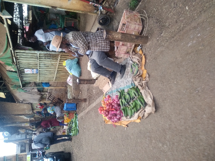 An outdoor market scene shows a vendor resting on a wooden support beam, wearing a plaid shirt and hat. He sits adjacent to crates and bags filled with produce. On a ground cloth are bunches of red onions and green bananas. Other vendors and shoppers are visible further down the street, alongside metal stalls and various containers. A car and pedestrians are also observed in the foreground.