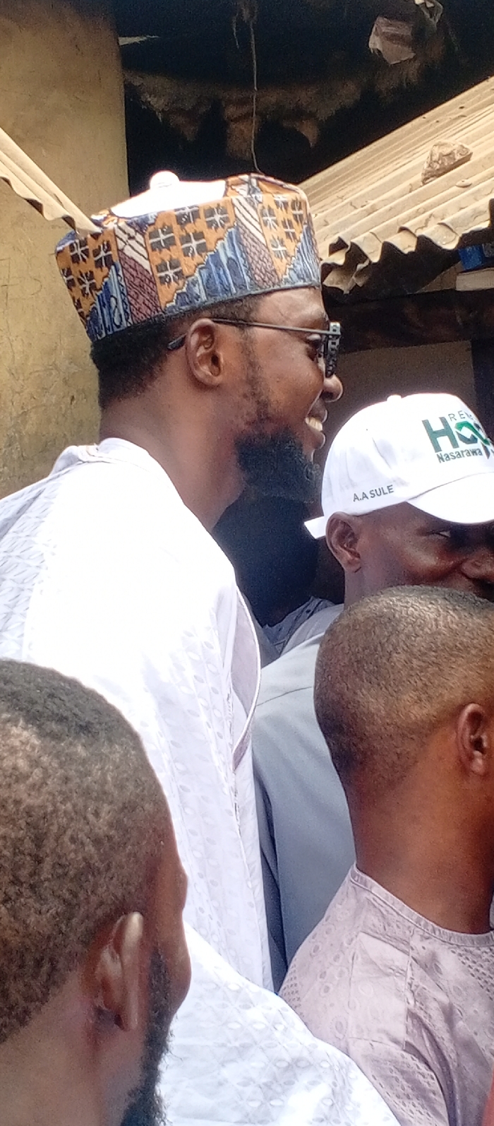The image displays a close-up of a group of dark-skinned individuals in Toto, Nigeria, primarily focusing on a central male figure. This individual, positioned left of center, wears dark-rimmed glasses, a short dark beard, a white long-sleeved garment with subtle patterned embroidery, and a multi-colored patterned cap featuring geometric and abstract designs in blue, brown, white, and orange. He is smiling and looking towards the right side of the frame. To his immediate right, another male is partially visible, wearing a white baseball cap embroidered with green text "REV HSS Nasarawa" and black text "A.A SULE." The backs of other individuals' heads with short, dark, cropped hair are visible in the foreground and mid-ground, indicating a crowd. The background consists of a light brown, indistinct wall and a weathered, corrugated iron roof, on which a small piece of rock or debris is visible. Above the roof line, a dark, shadowed opening or interior space is present.