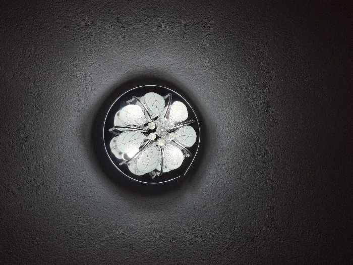 A circular ceiling-mounted light fixture is centered within the frame, affixed to a dark, textured ceiling. The fixture features a metallic, possibly chrome-plated, base ring from which approximately eight translucent, leaf-shaped diffusers extend radially outwards. These diffusers appear white or light gray and exhibit a subtle internal patterning. At the core of the fixture, a cluster of small, clear, faceted decorative elements, resembling crystals or glass beads, reflects light. The light source within the fixture is active, illuminating the diffusers and casting a soft glow on the immediate surrounding ceiling surface. The ceiling is a dark, uniform color, likely black or charcoal gray, and presents a coarse, stippled texture. No individuals, actions, or specific environmental context beyond the ceiling and light fixture are discernible. The scene is located in the city of Muldava, Bulgaria.